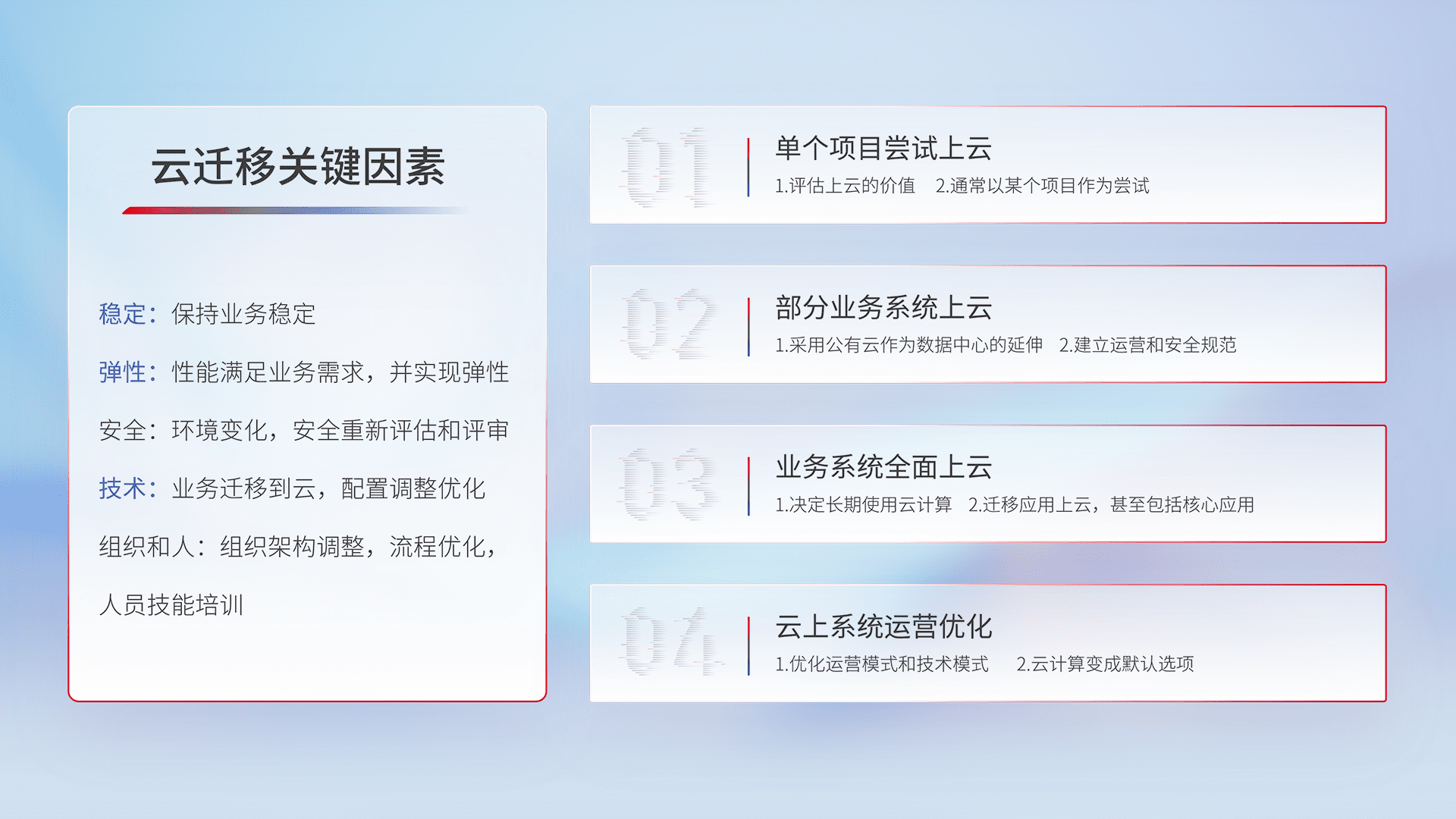 结合实际业务,,从规划设计、、云平台选型、、、、云原生改造、、数据迁移、、集成交付,,,迁移全过程为客户识别最佳上云路径,,,做好风险识别管理,,,,设计网络架构、、身份权限、、、安全审计合规、、操作审计、、日志审计、、监控告警策略、、、多站点容灾设计等,,对云上基础设施进行整体规划,,,,提升IT治理水平,,,,以满足弹性、、、高可用、、、高性能的需求。。。